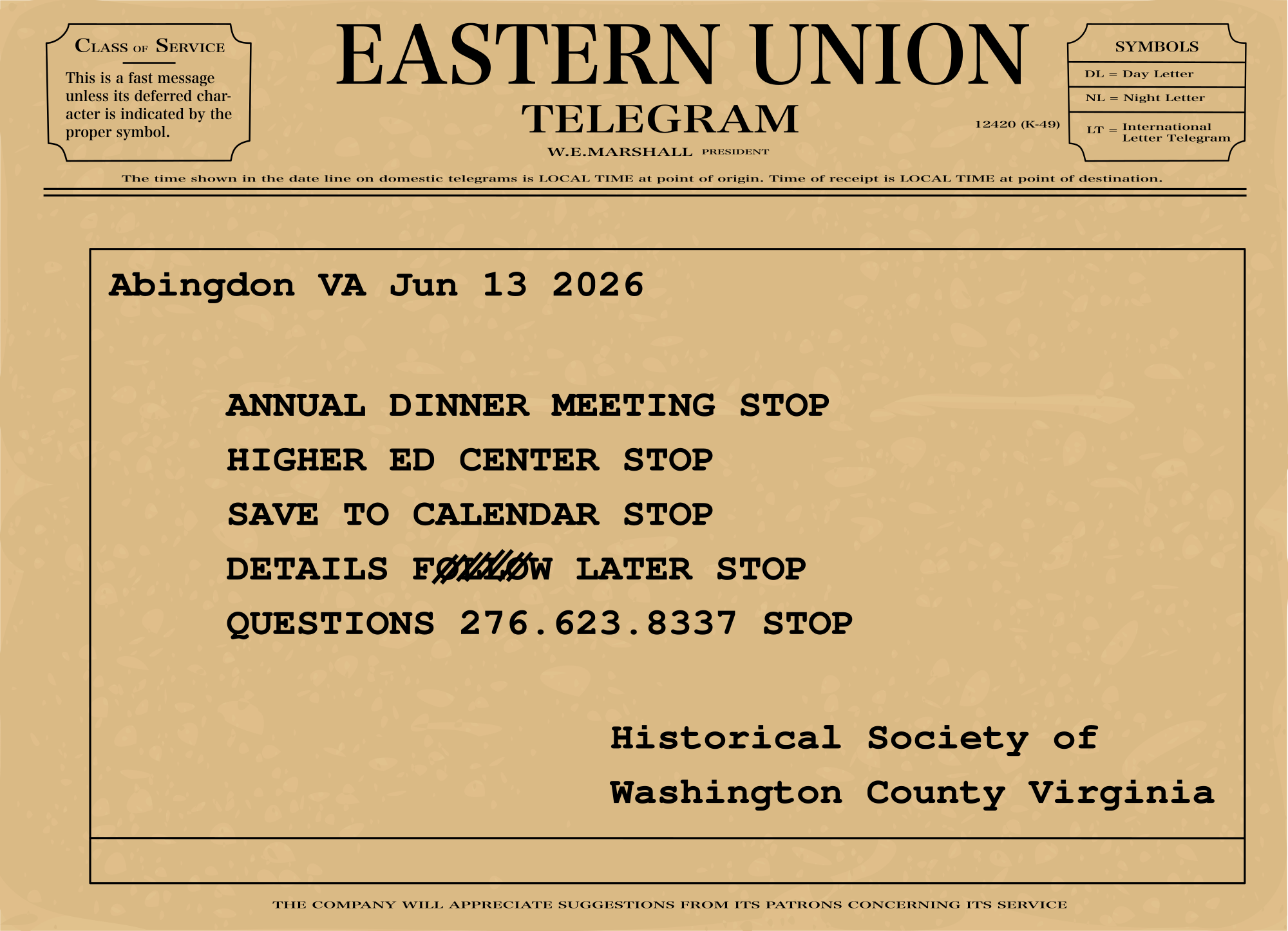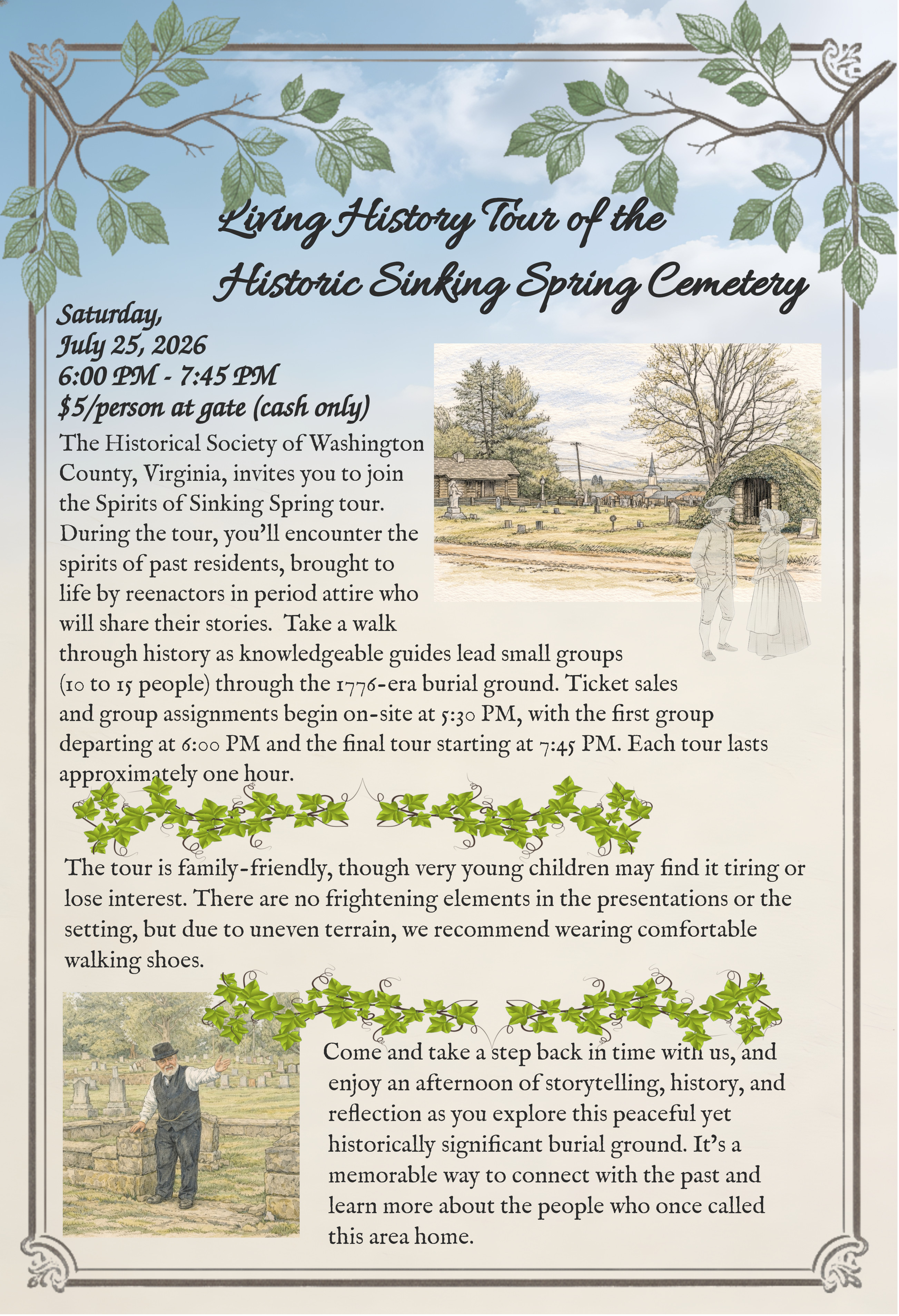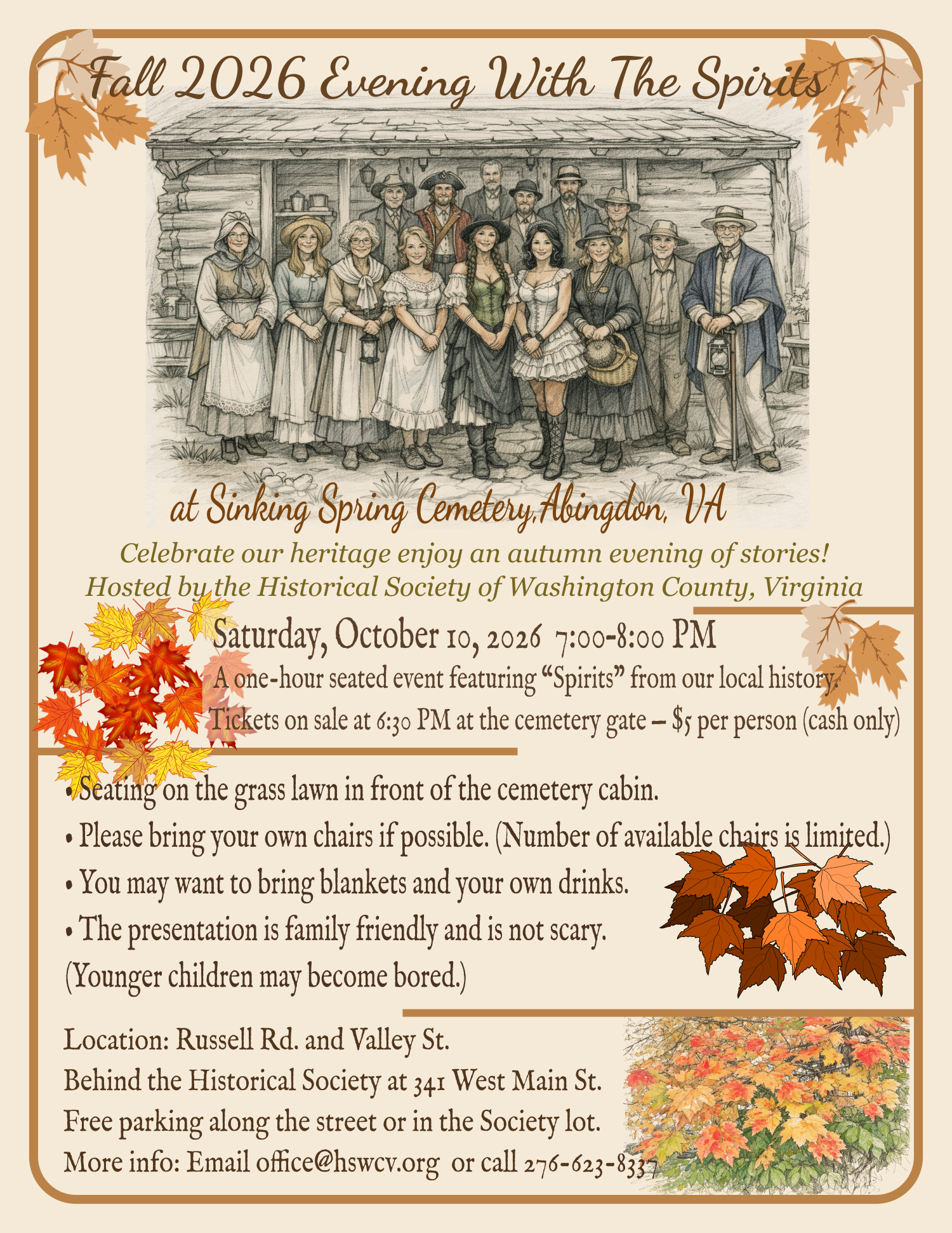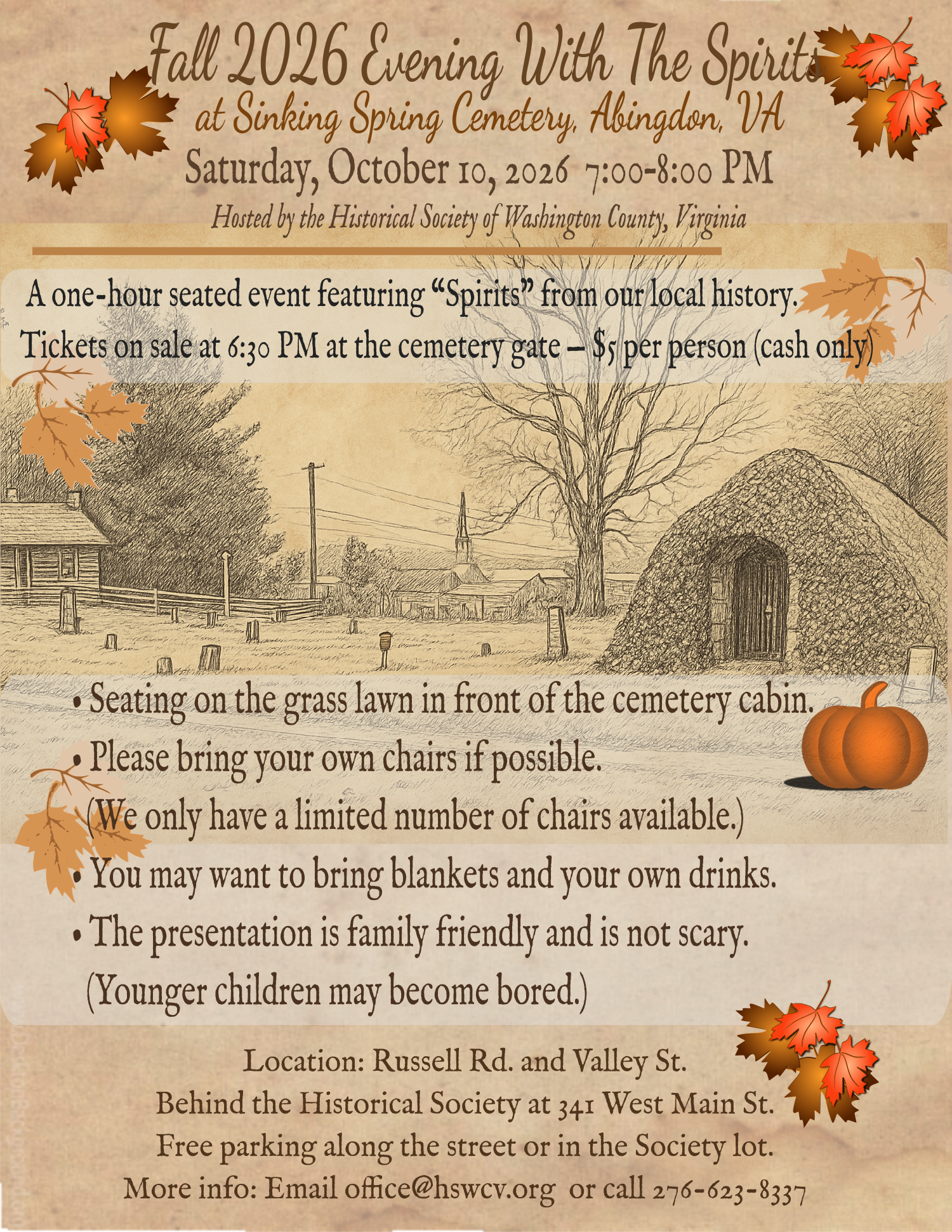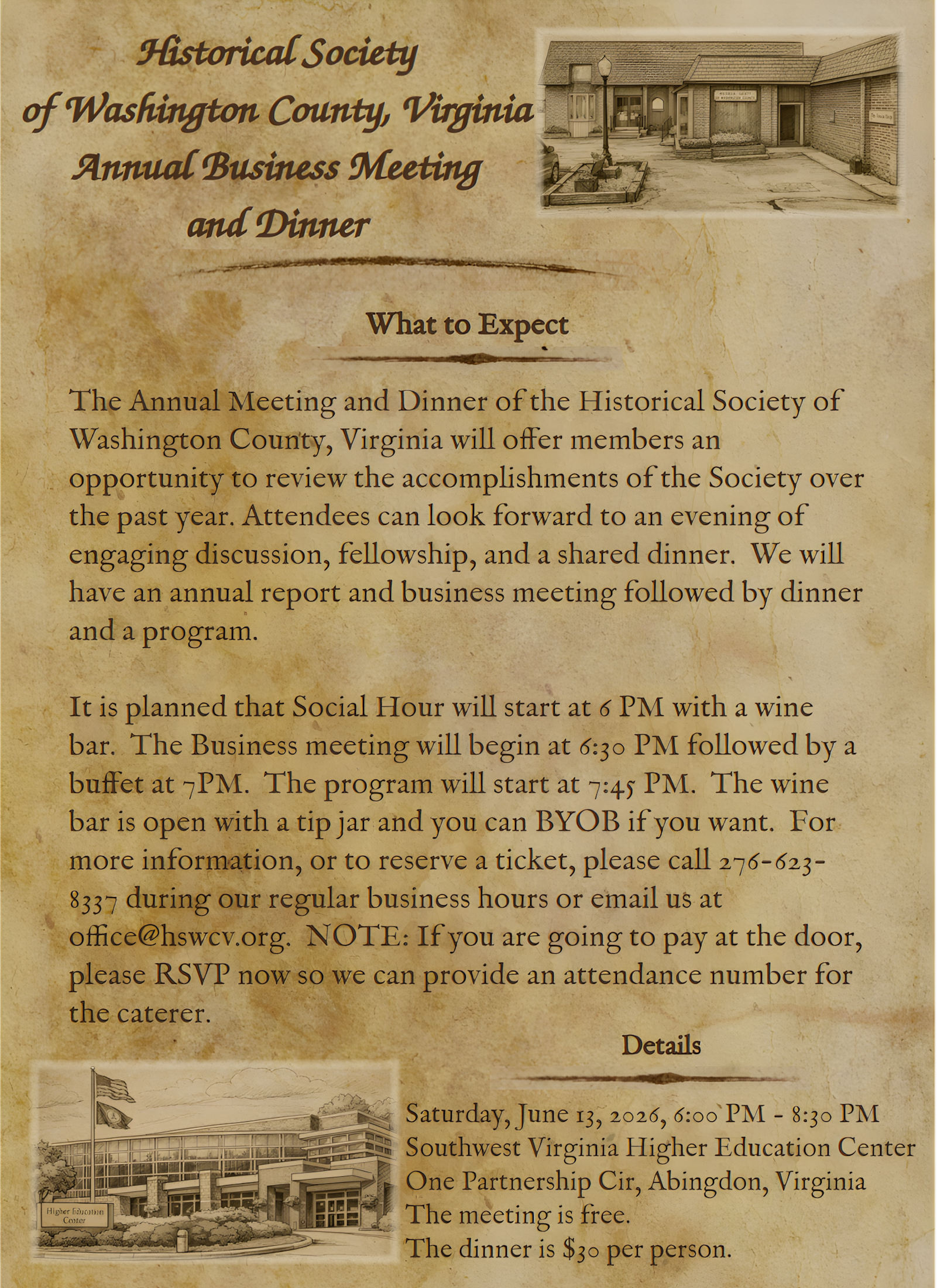 Historic Preservation Day May 1, 2026The Town of Abingdon's 4th Annual Historic Preservation Day features expert speakers, learning sessions, and a rare tour of the ongoing restoration of Retirement. The Historical Society is helping promote this event. RSVP required — food and drink provided throughout the day.