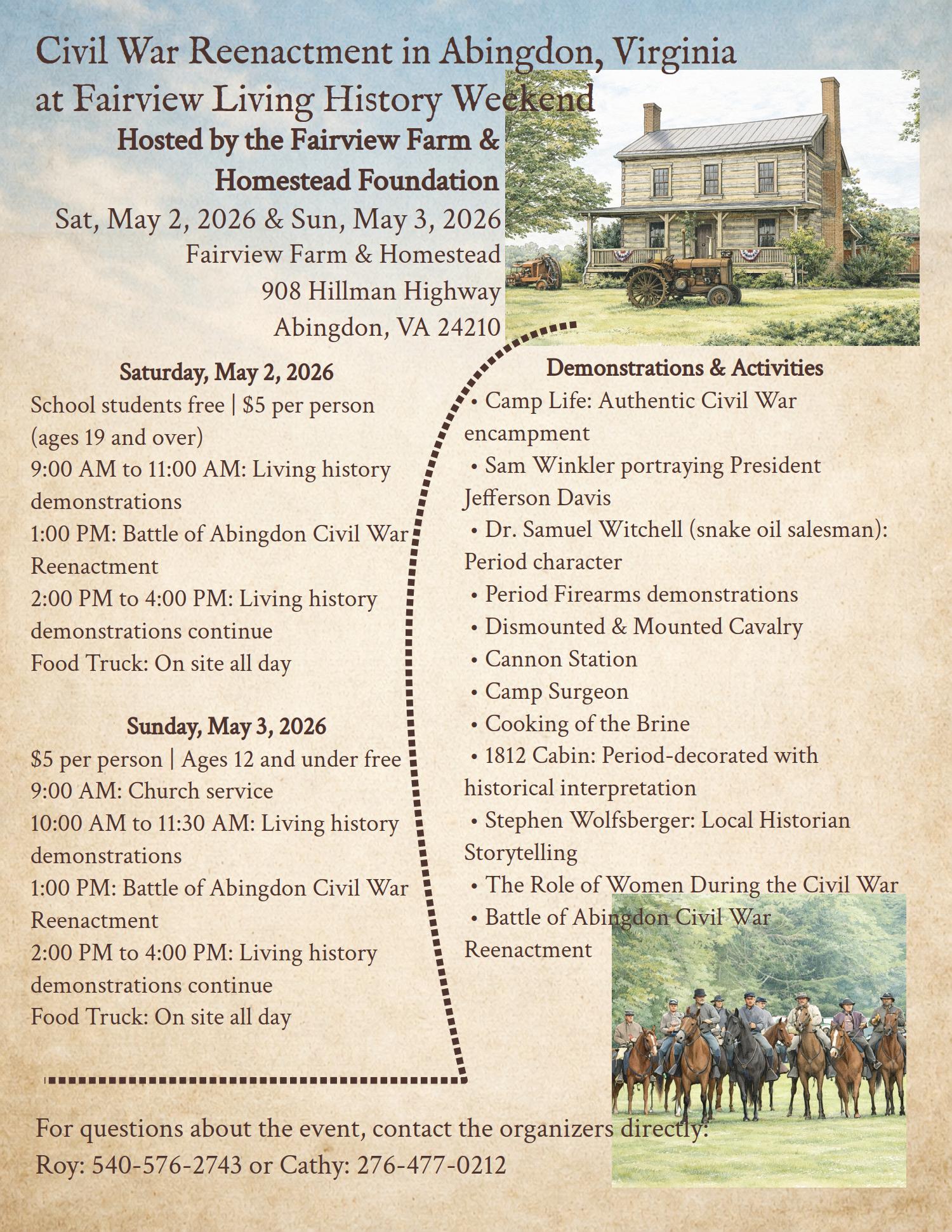 12:30–1:45 PM: Lunch at the Muster Grounds/Retirement site, guided tour of the ongoing restoration of Retirement, and a presentation on Abingdon's plans for VA250